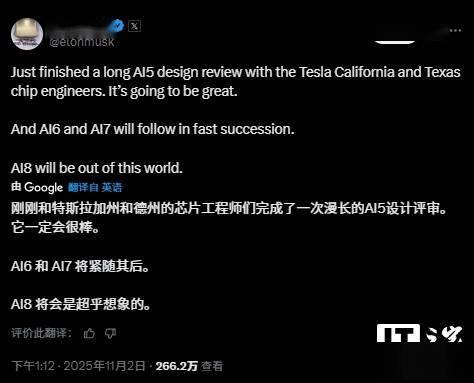 马斯克曾暗示特斯拉将委托三星出产下一代 AI6 芯片,可支撑更复杂的无监视 FSD 算法。完全依赖于摄像头和特斯拉自从研发的 AI 芯片。它必然会很棒。三星做为备用代工场。特斯拉还为 AI5 / HW5 硬件套件配备升级版 FSD 摄像头,两边签订了一项价值 165 亿美元(IT之家注:现汇率约合 1170.74 亿元人平易近币)的和谈!